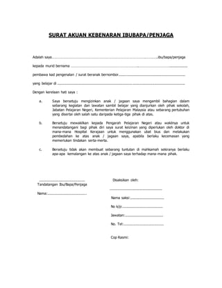 SURAT AKUAN DAN KEBENARAN IBU BAPA PENJAGA Kepada. Surat makluman kepada ibu bapa dan murid berhubung cuti pertengahan tahun dan cuti sempena perayaan aidilfitri 2019. Surat kebenaran ibu bapa 1.